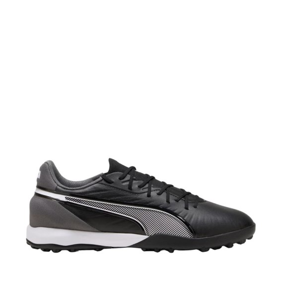 Turfy męskie Puma King zapewniają lepszą przyczepność i szybkość reakcji podczas treningów odbywających się na sztucznych nawierzchniach trawiastych. Sznurowana konstrukcja. Cholewka z przyjaznej środowisku skóry syntetycznej. Gumowa podeszwa zewnętrzna.